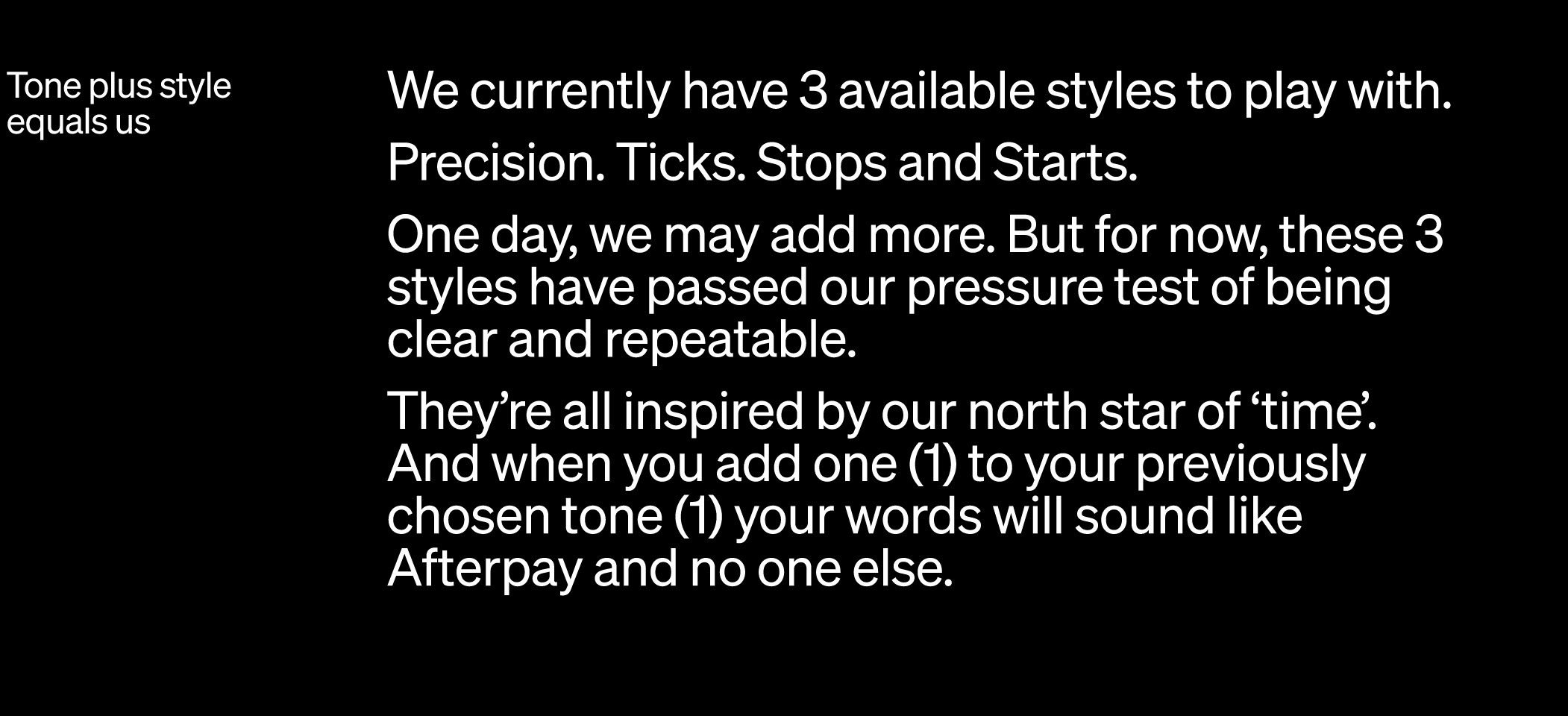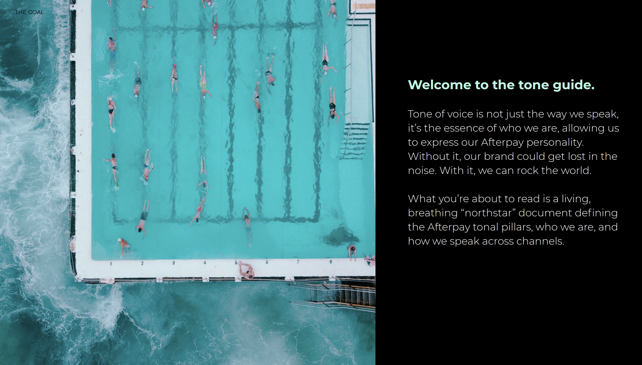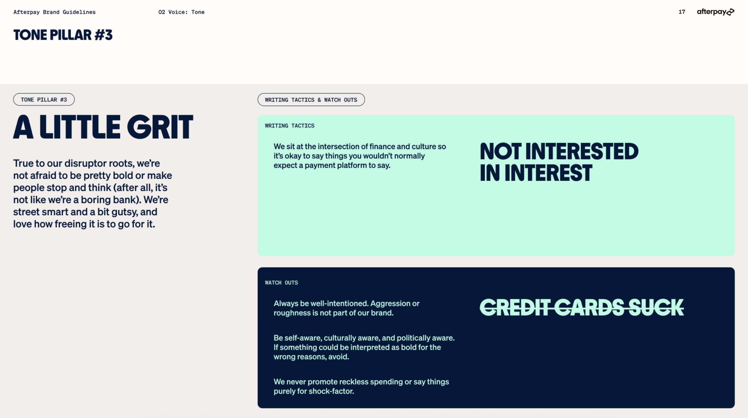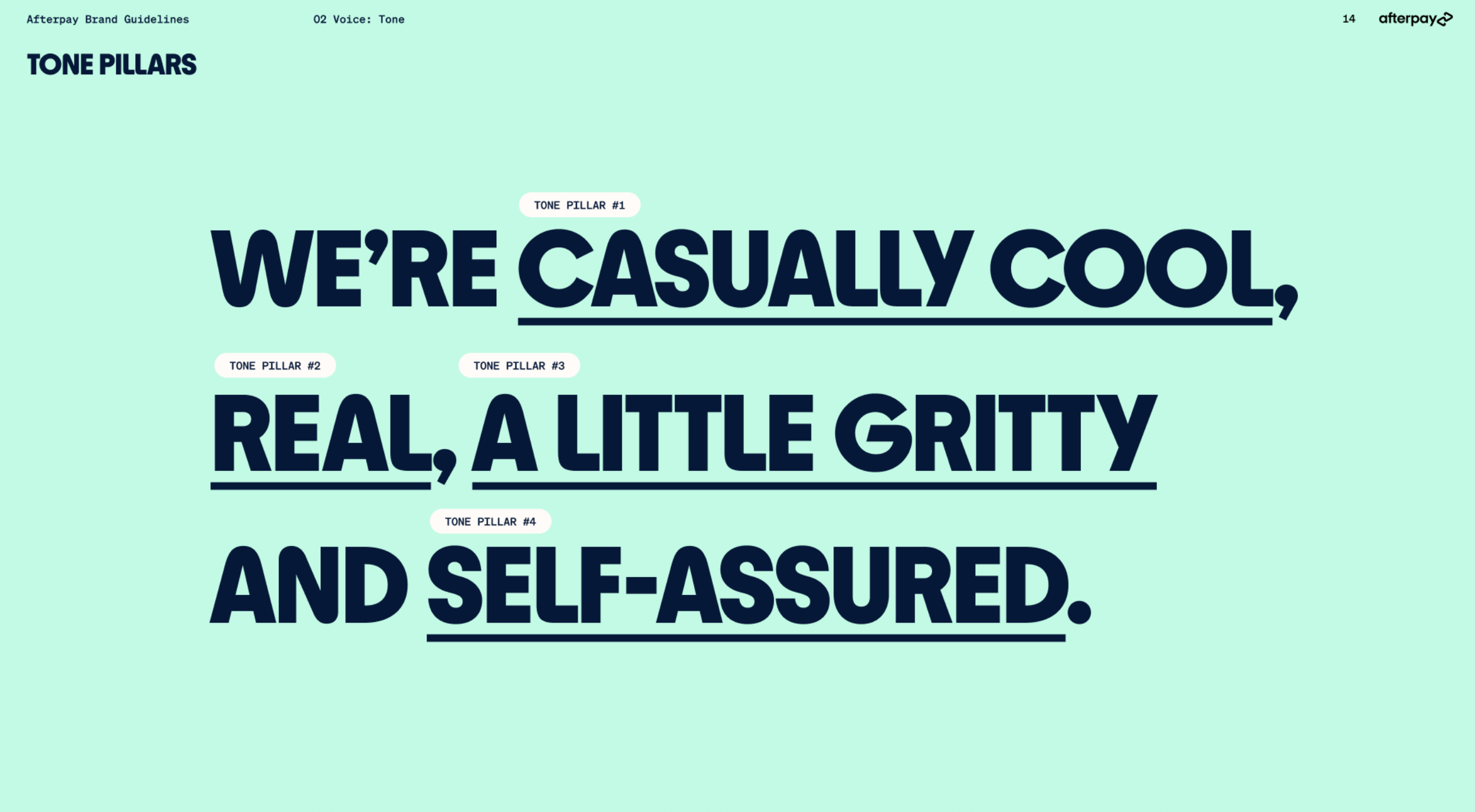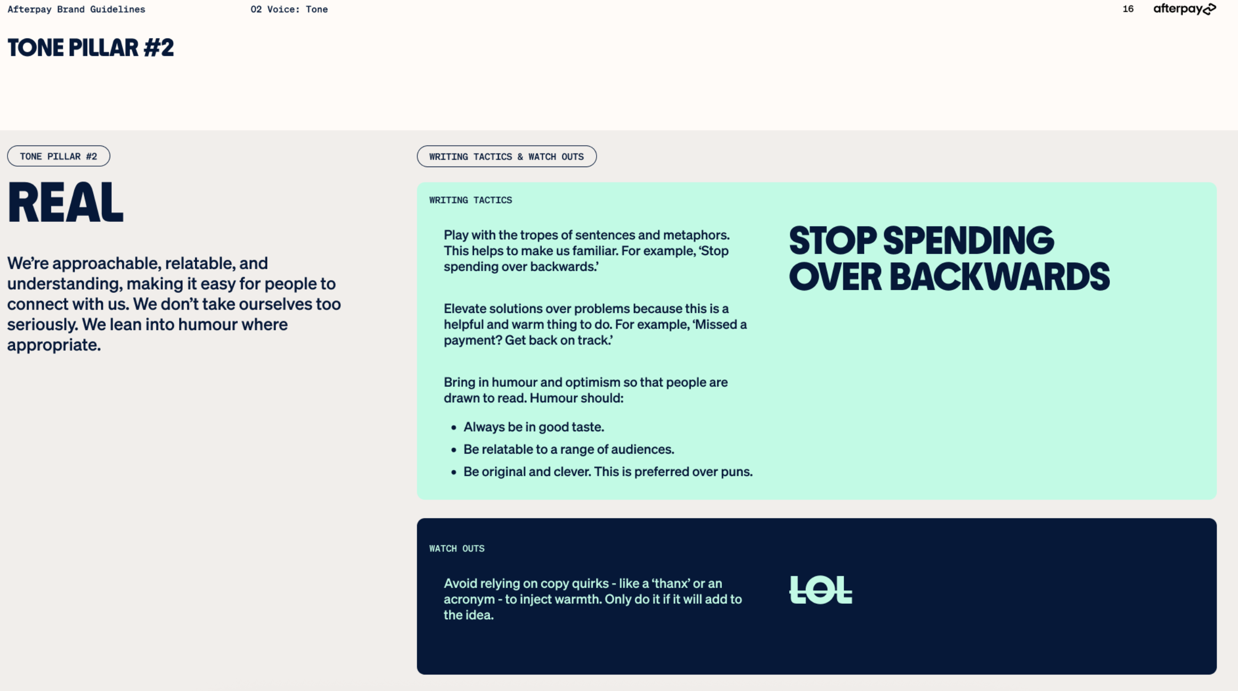 I built Afterpay’s first ever comprehensive tone bible from the ground up. And developed and defined every iteration following. What exists now is distictly Afterpay, policed to the comma, and lived and breathed by every creative working for the brand.
