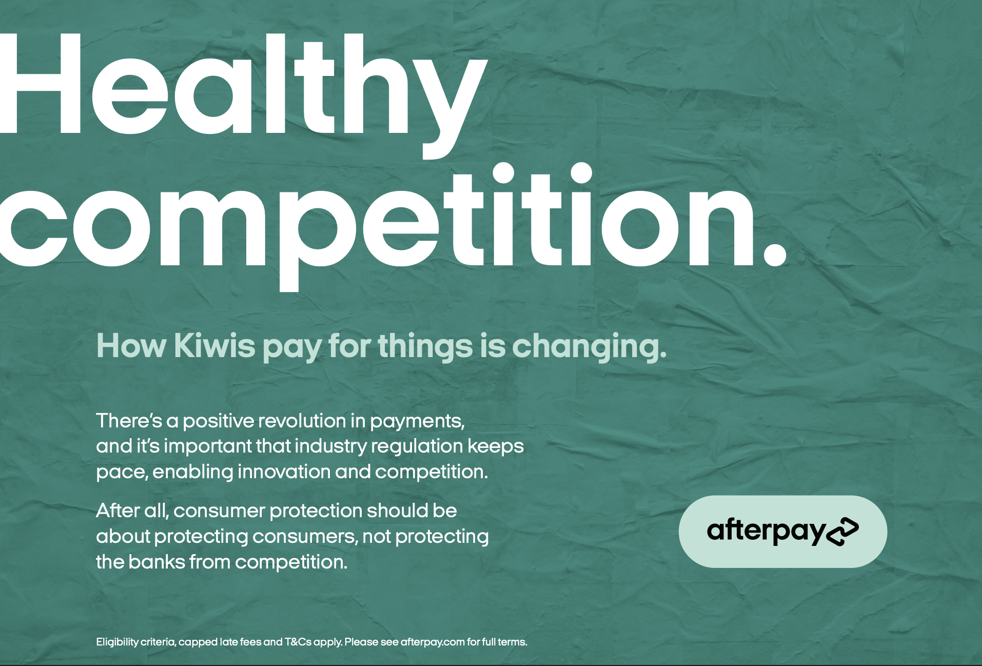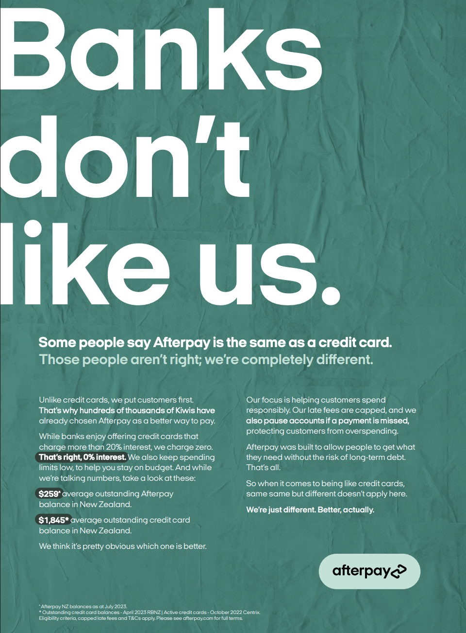 I was the lead creative and writer working cross-functionally with brand, marketing, policy and compliance to develop a particular aspect of the truths campaign aimed at lobbying New Zealand policymakers regarding regulatory frameworks around BNPL tools. The output was a suite of print, OOH and digital creative anchored in a bold narrative, which successfully shifted regulation in Afterpay’s favour.